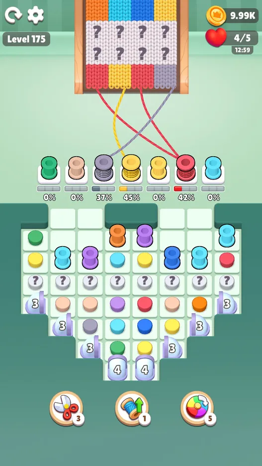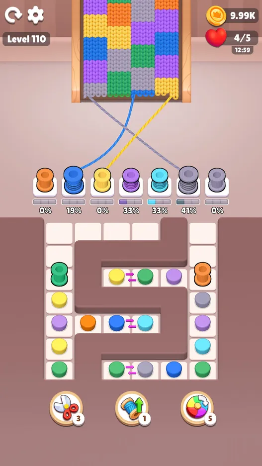 In the game Color Knitzy, spools of yarn are located at the bottom of the game area. However, not all spools are immediately available. Some are activated only after slots become available. Start by untangling patterns with the longest threads. This will prevent you from running out of moves. As you progress through the game levels, you’ll gain power-ups and enjoyable bonuses, making the tasks much more engaging.