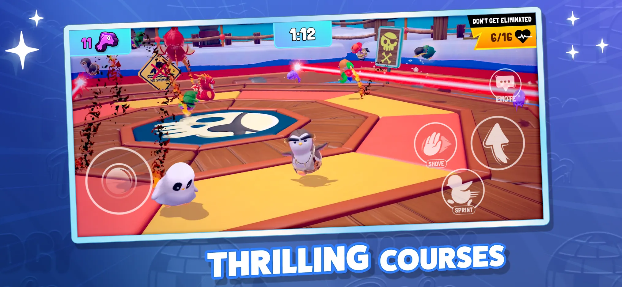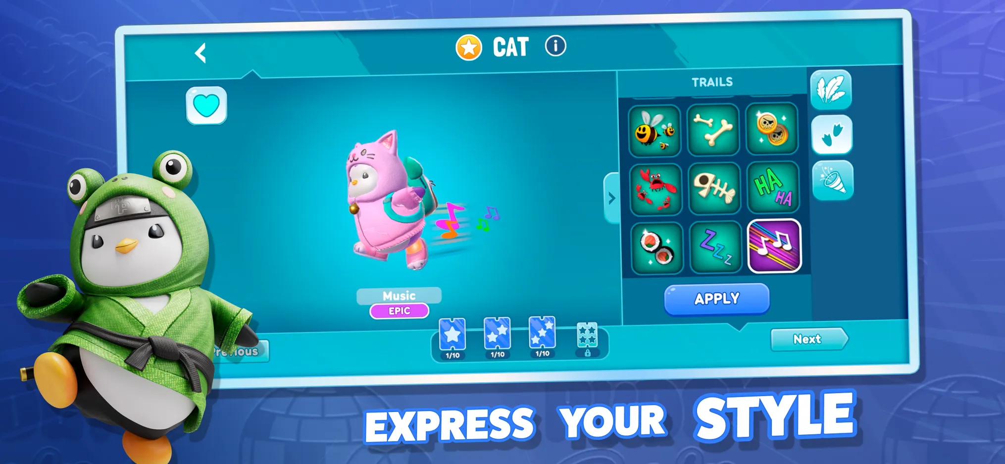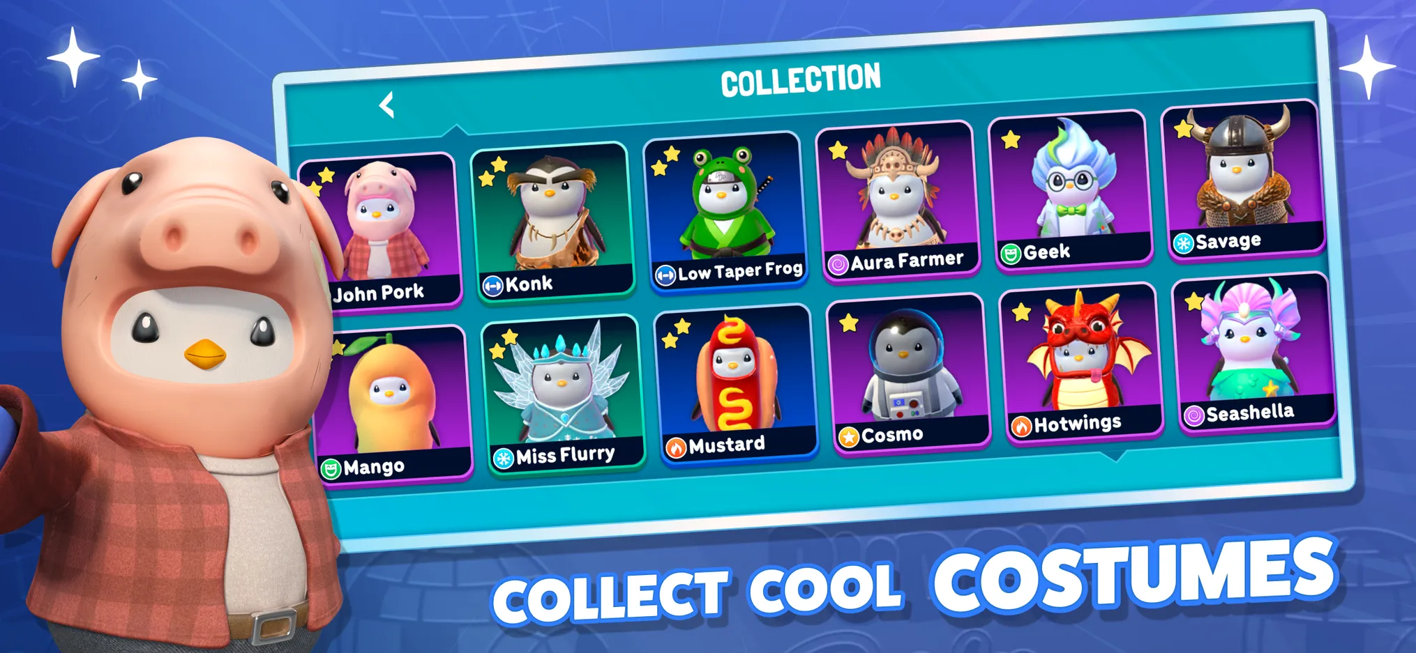 In the game Pudgy Party, available character skills will help you overcome all the challenges and overcome the traps set for you. You can participate in battles not only alone but also as part of a team. The customization pack offers a variety of unique costumes: from a simple scarf to a cute frog skin. Upgrade your character and head out onto the obstacle course to complete tasks.
