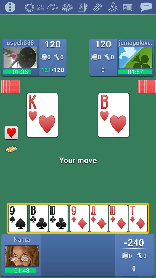 In the game Thousand 1000 Online, beginners will find all the essential information in the rules section. You’ll learn about the Golden Round, the buy-in, game points for cards, bidding, and much more. Create a comfortable environment by opening a private lobby, where only trusted players will receive an invitation. Each game will be considered completed if one of the participants manages to score at least 1000 points. To be that lucky player, collect the most valuable hands.